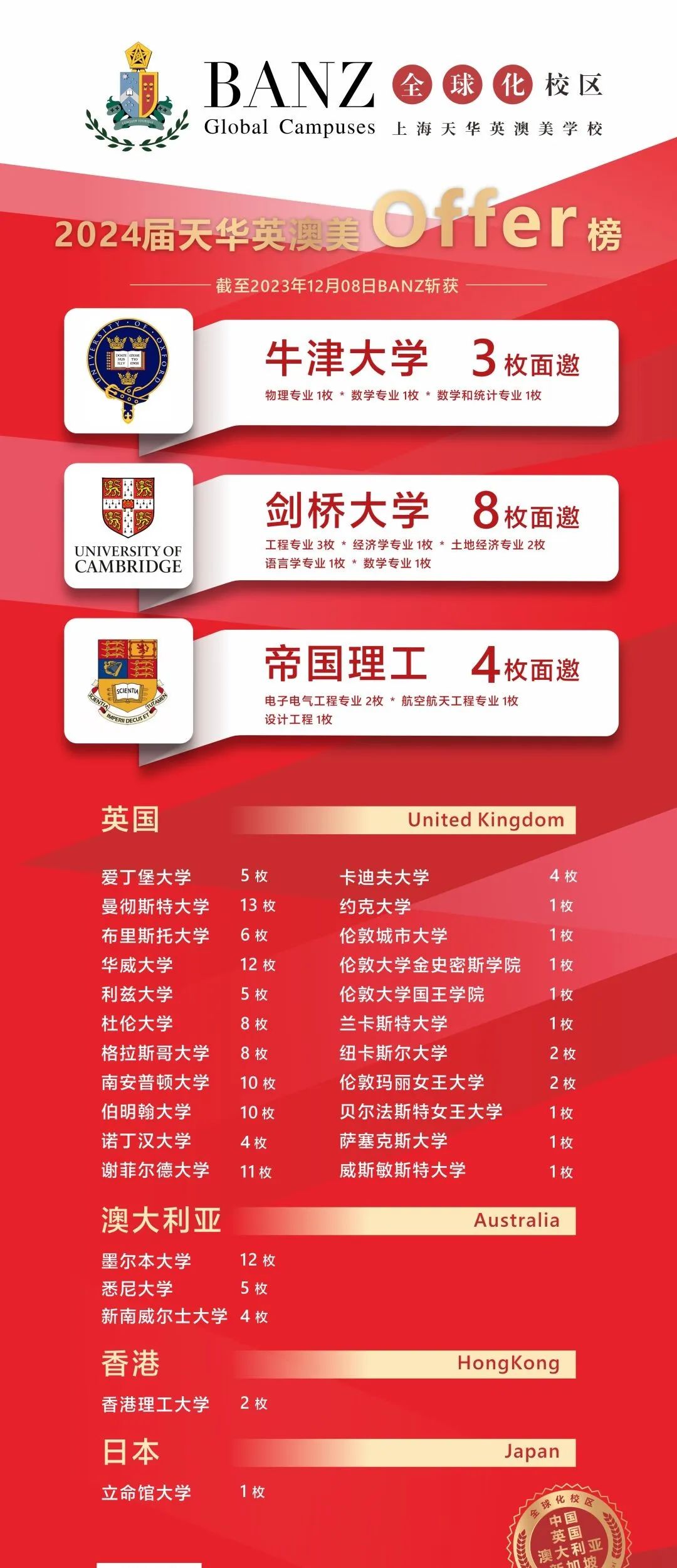 截止2023年12月8日,2024屆BANZ畢業生已收獲:11枚牛劍面邀、4封帝國理工面邀、132封世界名校Offer!