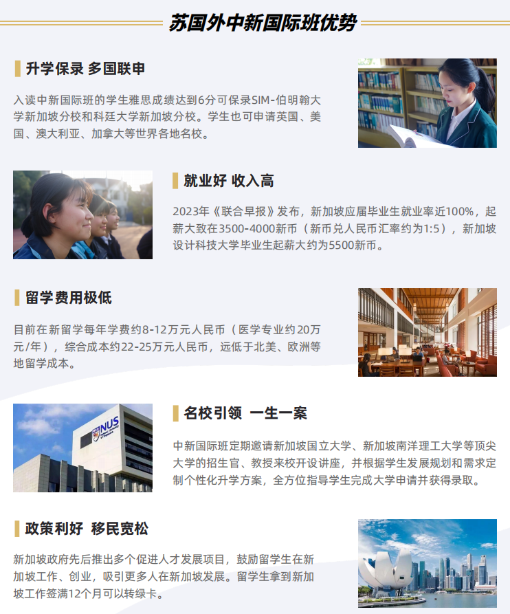 蘇國外中新國際班項目以A-LEVEL為核心課程,增設演講與辯論課程、升學指導課程及新加坡國立大學研修課程。該項目以新加坡的國家優勢與教育優勢為背景,實施因材施教、因材申校,為每個學生提供個性化的教學及升學規劃。中新項目以新加坡名校保錄護航,聯申英聯邦名校,幫助學生規劃最優的升學路徑,實現名校夢想,領創美好生活。