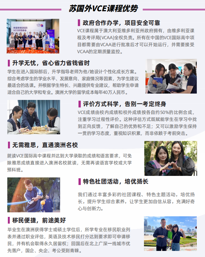 蘇國外2008年開辦VCE項目,是蘇州唯一開設此項目的國際學校。該項目省錢、省時、省力、省心,學生在校完成3年的澳洲高中課程后獲得維州高中文憑。學生在蘇國外國際部就讀時,由中外教師共同授課,畢業后可申報英、美、加、澳等國所有以英語為教學語言的國際著名大學。