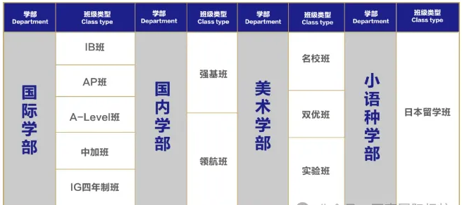 國內高考方向,開設強基班、領航班、美術特色班、復讀班、高三藝考文化課班;國際升學方向,開設IBDP、AP、Alevel、國際藝術、中加2+1留學班、日本留學班。